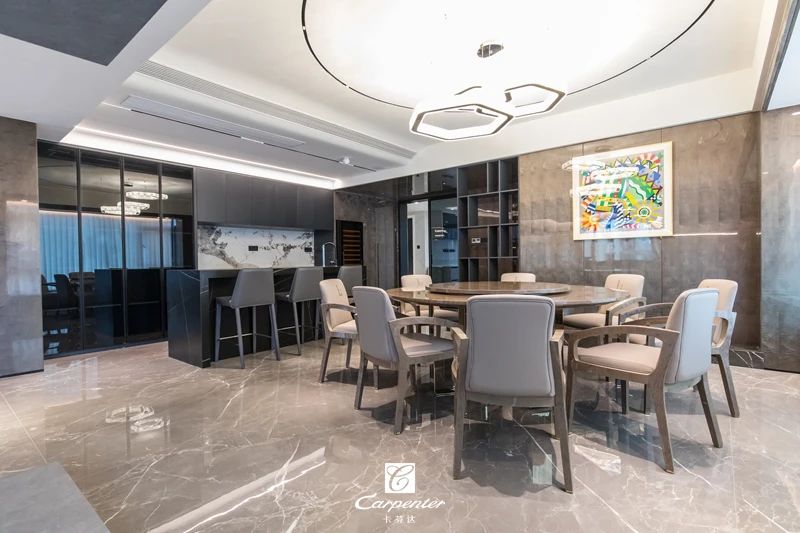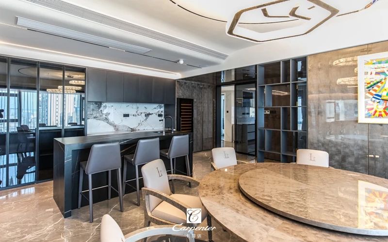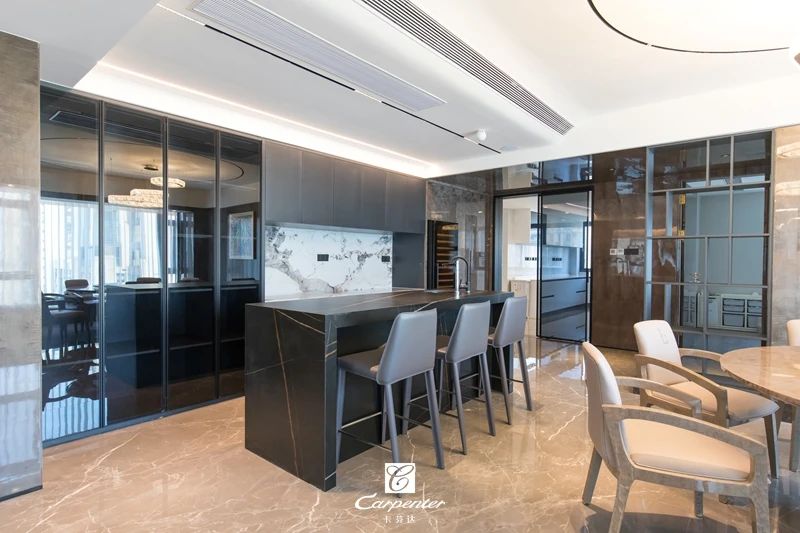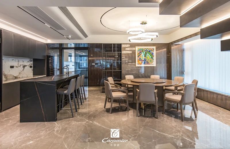 餐廳相鄰而設(shè)的吧臺(tái)兼具島臺(tái)功能